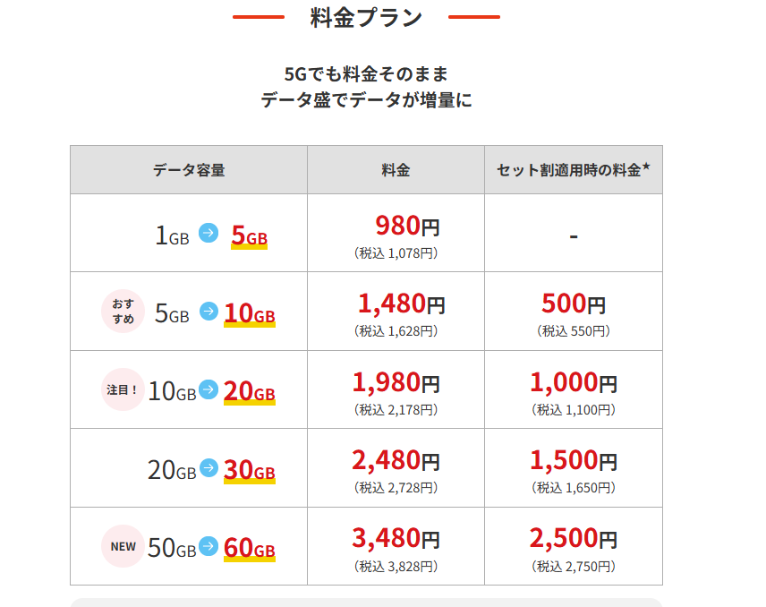 データ盛適用で1GBがデータ増量で5GB、5GBがデータ増量で10GB、10GBがデータ増量で20GB、20GBがデータ増量で30GB、50GBがデータ増量で60GB。