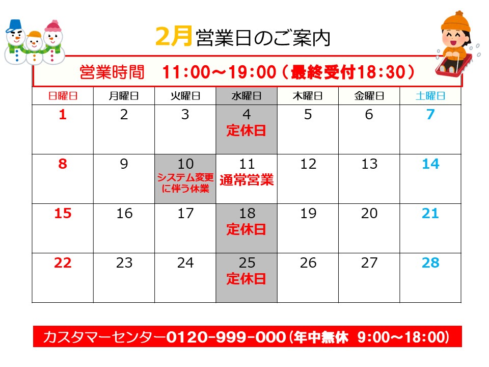 | 営業時間 | 11:00~19:00(最終受付18:30) |