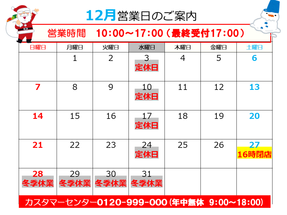 | 営業時間 | 通常時間 10:00~17:00 変則営業日 11/6(木)は14:00開店 |