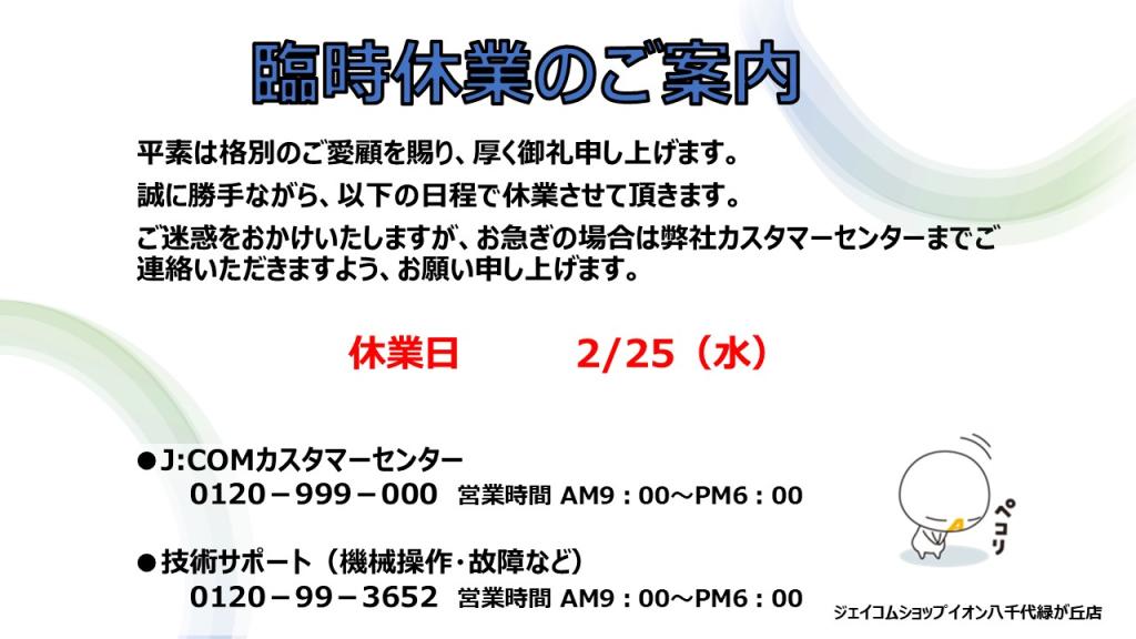 | 定休日 | 火曜 2/25(水)臨時休業 |